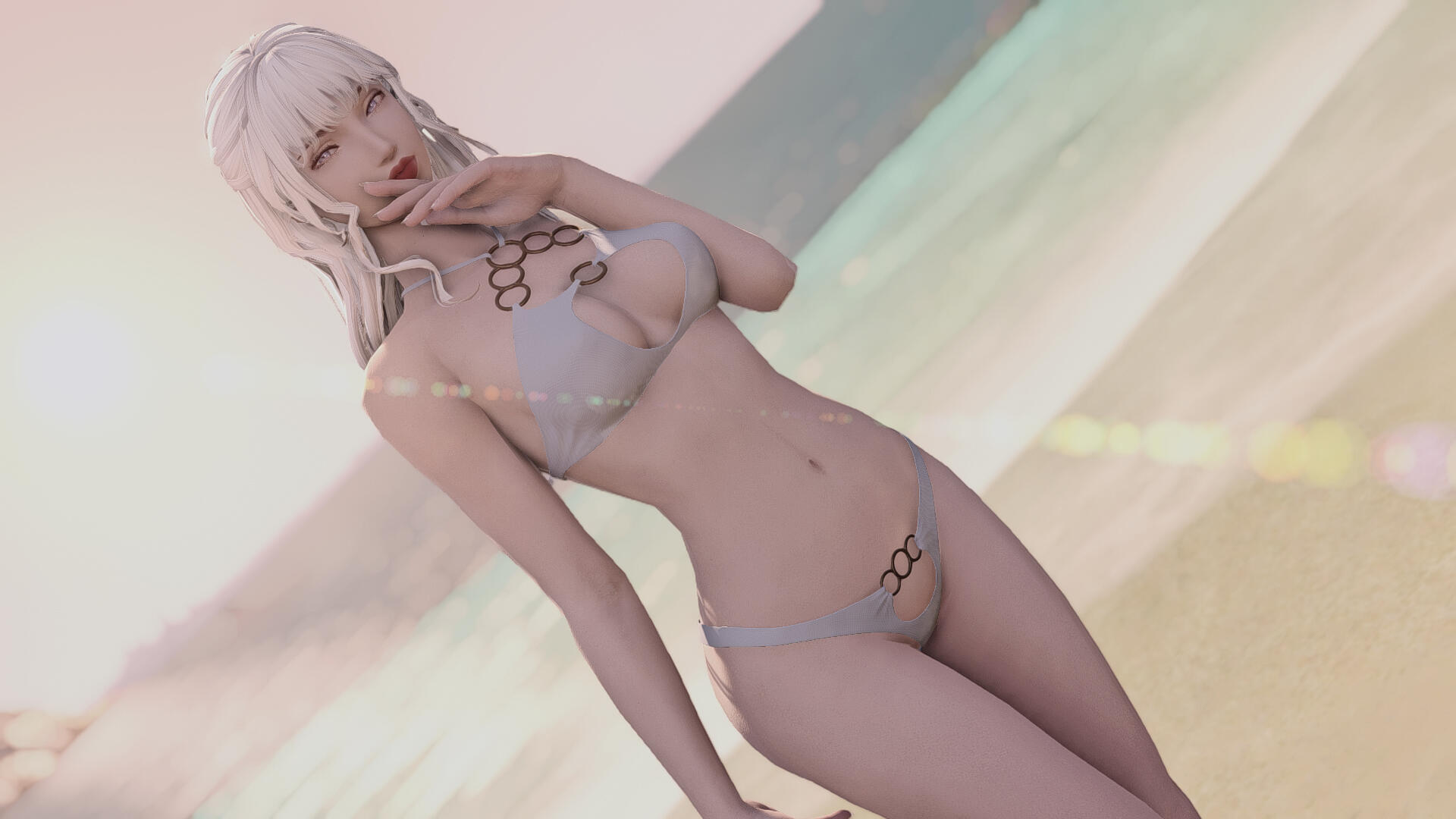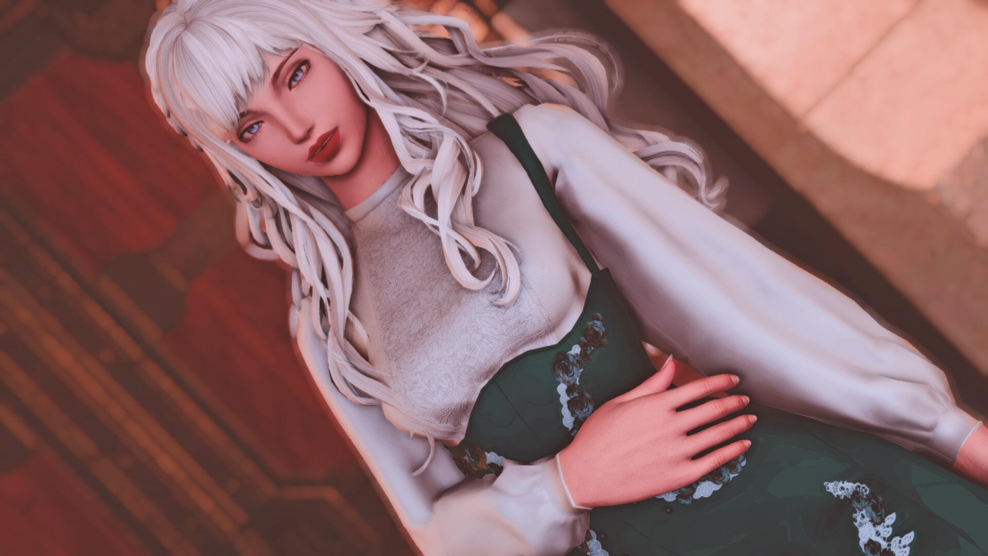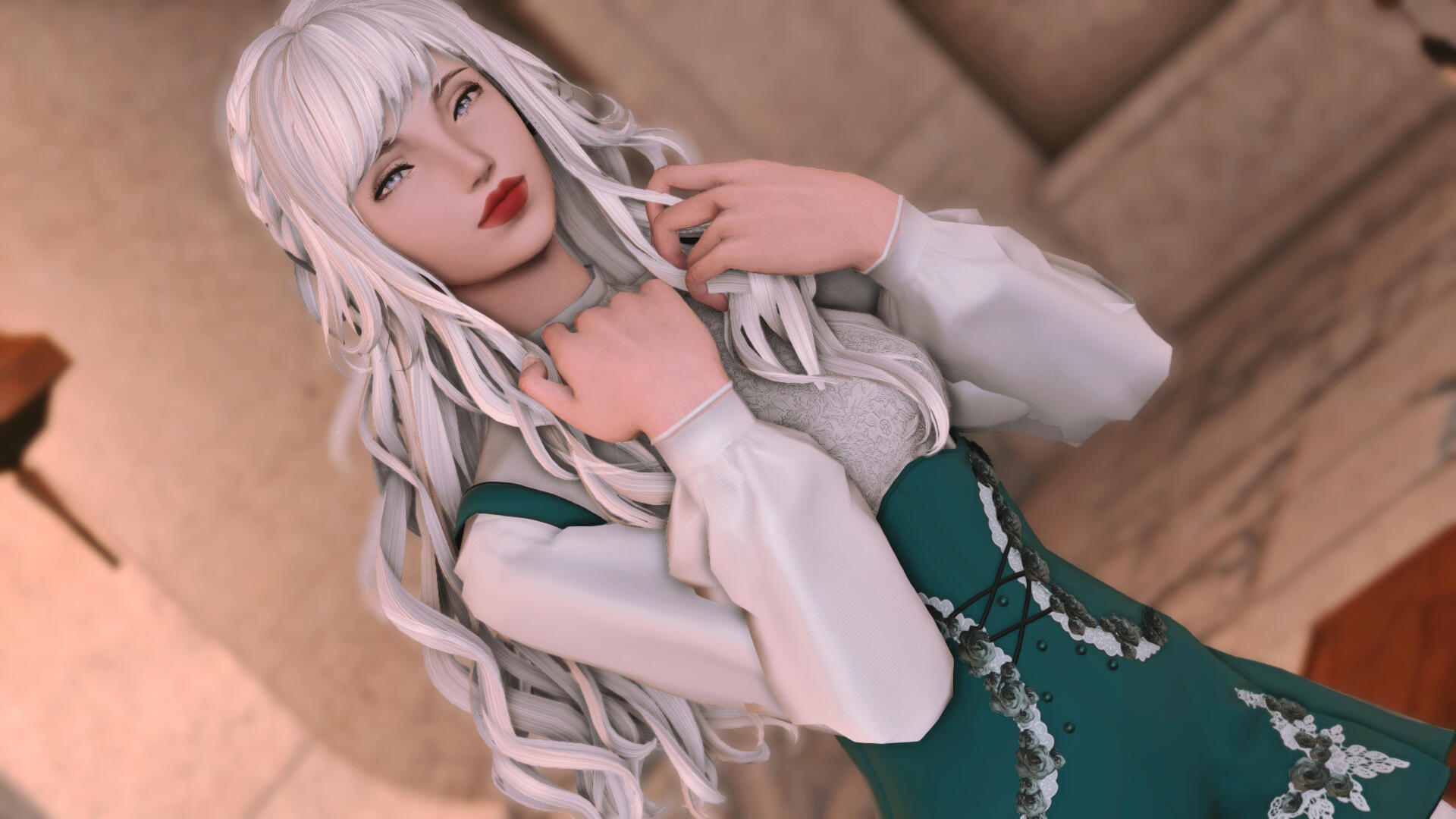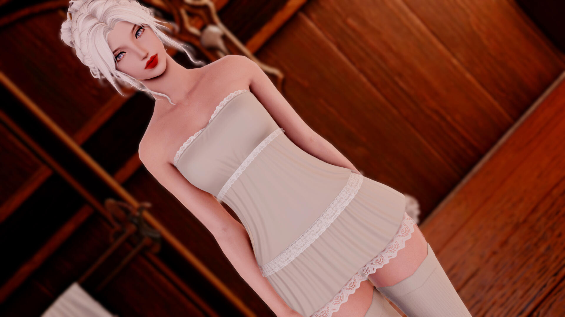 Distinguishing Features: Full lips, long white hair that's typically pulled back into a braid.