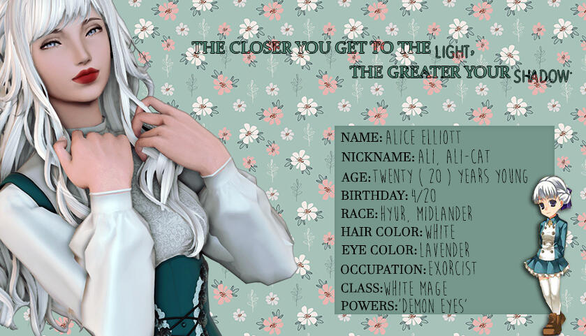 Please don’t take information from me. While I did not originate the concept of her ( Alice Elliot is a character from Shadow Hearts ), within Final Fantasy XIV she is of my own creation and I have worked very hard on her.